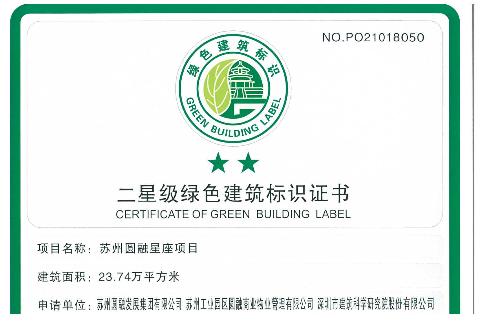 2018年圓融星座項目獲省二星級綠色建筑標識證書(shū)