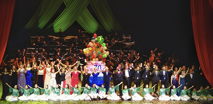 為了慶祝新中國成立70周年,整以美聲唱法、交響伴奏為主,融入評彈、京劇、黃梅戲等傳統藝術(shù)的表演形式,選取70年來(lái)經(jīng)典傳唱、鼓舞人心的音樂(lè )作品,為觀(guān)眾呈現一臺高水準、高品質(zhì)、中西合璧、跨界融合的精彩演出,展現新中國在中國共產(chǎn)黨領(lǐng)導下,戰勝艱難險阻,譜寫(xiě)壯麗詩(shī)篇的宏大主題。更令人感動(dòng)的是尾聲環(huán)節,藝術(shù)團孩子們清唱著(zhù)《祝你生日快樂(lè )》,手托五星紅旗莊重的走上舞臺,并將國旗展開(kāi)在舞臺上,接著(zhù)《我和我的祖國》響起,全場(chǎng)歌手合唱,這一刻大家都熱血沸騰、激情昂揚,孩子們眼中閃爍著(zhù)愛(ài)國的青春熱情和堅定力量。