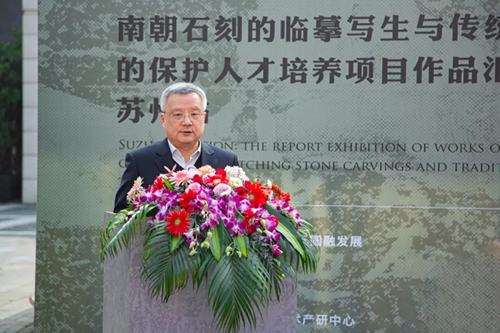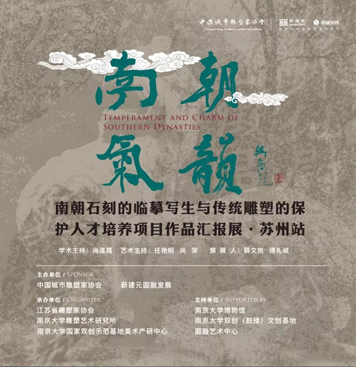南京大學(xué)雕塑藝術(shù)研究所李巖將石刻作《月下松濤醉——陶淵明》贈與圓融藝術(shù)中心永久珍藏。最后,由在場(chǎng)領(lǐng)導和藝術(shù)家共同剪彩,見(jiàn)證“南朝氣韻——南朝石刻的臨摹寫(xiě)生與傳統雕塑的保護人才培養項目作品匯報展·蘇州站”正式拉開(kāi)帷幕。