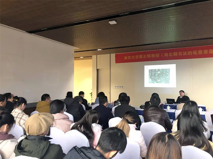 除了精美的雕塑展覽外,江蘇省書(shū)法家協(xié)會(huì )副主席、江蘇省直書(shū)法家協(xié)會(huì )主席、南京大學(xué)教授、碩士研究生導師黃正明還在現場(chǎng)為大家帶來(lái)《南北朝書(shū)法的筆墨意蘊》學(xué)術(shù)講座。