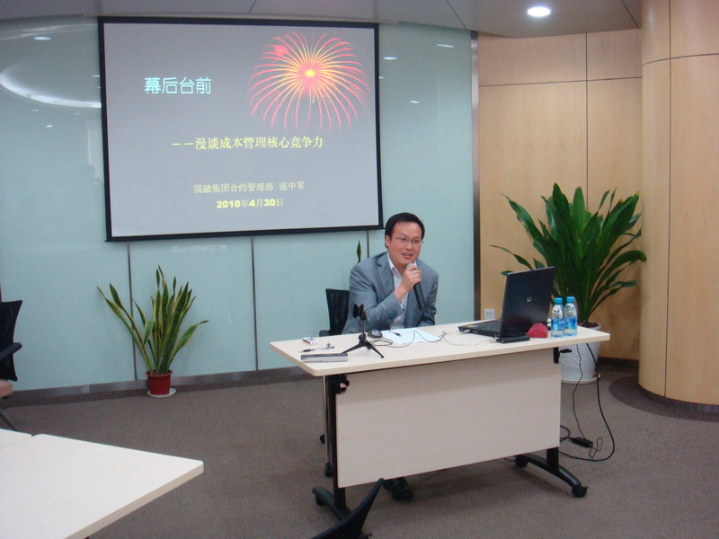 2010年4月30日,圓融集團合約管理部的張中軍為來(lái)自集團項目開(kāi)發(fā)部、項目規劃部、圓融星座項目部、李公堤三期項目部、財務(wù)部、商管公司和管理層的40余名同事舉辦了以“成本管理核心競爭力”為主題的培訓講座。此次講座也是集團2010年內部培訓系列的第二講。