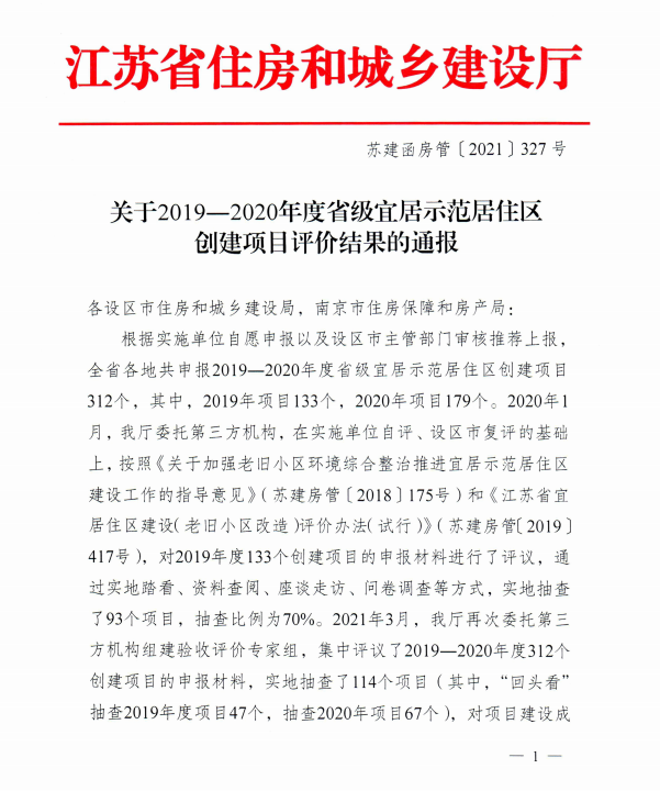 近日,經(jīng)綜合評審和公示,江蘇省住房和城鄉建設廳公布了2019-2020年度省級示范居住區名單,共評選出“省級宜居示范居住區”308個(gè),其中新建元控股集團旗下無(wú)錫圓融開(kāi)發(fā)運營(yíng)的融禾花苑小區成功上榜。