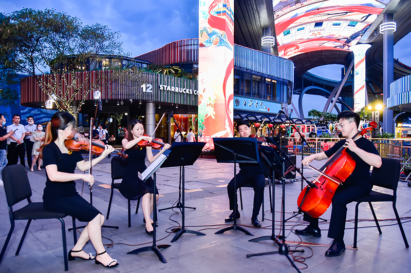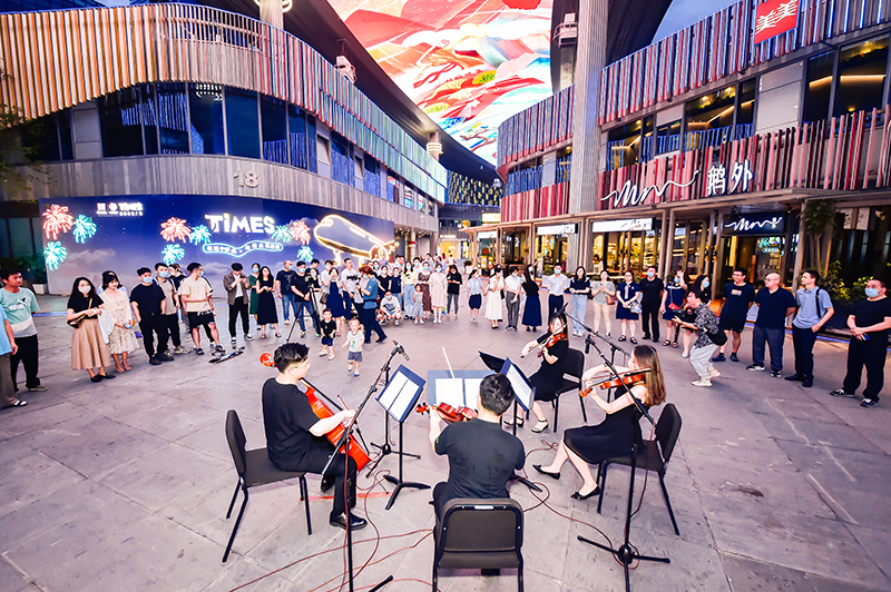 花燈初上金雞湖,天幕花開(kāi)伴歌舞。6月23日晚,由蘇州工業(yè)園區國資黨委主辦,新建元集團黨委、新時(shí)代集團黨委協(xié)辦的獻禮“七一”快閃活動(dòng)在圓融時(shí)代廣場(chǎng)天幕“時(shí)代小劇場(chǎng)”成功舉辦,獲得了往來(lái)市民游客的點(diǎn)贊和好評?!段液臀业淖鎳?、《瑤族舞曲》,一首首經(jīng)典名曲以弦樂(lè )四重奏的形式在夜晚的圓融天幕下奏響,樂(lè )聲悠揚動(dòng)聽(tīng),吸引了大批街區市民的駐足欣賞。在美妙的弦樂(lè )演奏中,圍觀(guān)群眾紛紛陶醉其中,并自發(fā)踴躍地加入到了合唱的隊伍中來(lái)。