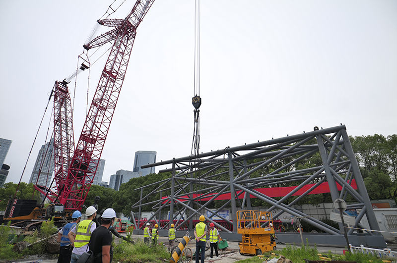 鋼結構巨型桁架安裝的施工難度大,安全風(fēng)險極高,為保障鋼結構桁架吊裝的安全性和準確性,項目組組織專(zhuān)家論證吊裝方案、規劃吊裝路徑,最終確定采用在地面完成巨型桁架的拼裝后,在桁架下方中間位置設置臨時(shí)支撐,再分兩段進(jìn)行吊裝的方案,選用400噸履帶式起重機進(jìn)行吊裝。