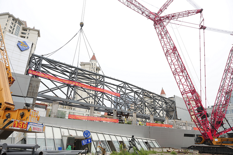 繼7月14日第一段巨型桁架吊裝到位后,7月16日,伴隨著(zhù)400噸履帶式起重機吊索的徐徐下放,第二段巨型桁架平穩、準確的安放至游泳館主樓基礎上,這也意味著(zhù)由新建元圓融投資建設的星海游泳館維修翻新工程鋼結構工程巨型桁架順利吊裝成功。