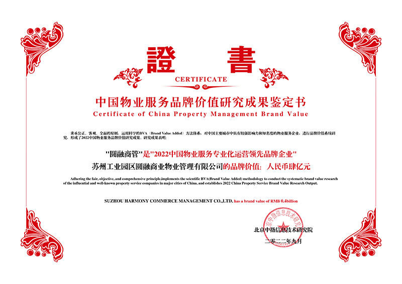 2022年9月15日,由中國企業(yè)評價(jià)協(xié)會(huì )、清華大學(xué)房地產(chǎn)研究所、北京中指信息技術(shù)研究院主辦,北京中指信息技術(shù)研究院中國房地產(chǎn)TOP10研究組承辦的“2022中國房地產(chǎn)品牌價(jià)值研究成果發(fā)布會(huì )暨第十九屆中國房地產(chǎn)品牌發(fā)展高峰論壇”在北京隆重召開(kāi)?;顒?dòng)中,新建元控股集團旗下圓融發(fā)展公司(以下簡(jiǎn)稱(chēng)“新建元圓融發(fā)展”)榮膺“2022中國商業(yè)地產(chǎn)公司品牌價(jià)值TOP10”稱(chēng)號;斜塘老街項目以致力于打造中式風(fēng)格、園林式特色商業(yè)街的創(chuàng )新性做法,榮膺“2022中國商業(yè)地產(chǎn)項目品牌價(jià)值TOP10”稱(chēng)號;新建元圓融發(fā)展全資子公司圓融商管榮膺“2022中國物業(yè)服務(wù)專(zhuān)業(yè)化運營(yíng)領(lǐng)先品牌企業(yè)”。