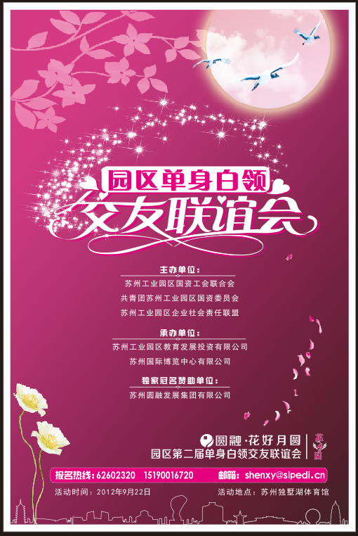 由園區國資工會(huì )、共青團園區國資委、園區企業(yè)社會(huì )責任聯(lián)盟主辦,圓融集團獨家冠名的圓融·花好月圓—園區第二屆單身白領(lǐng)交友聯(lián)誼會(huì )將于9月22日在蘇州獨墅湖體育中心舉行。