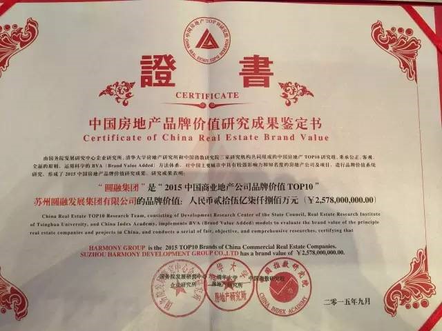 2015中國房地產(chǎn)品牌價(jià)值研究成果發(fā)布會(huì )上,新建元控股旗下圓融集團自2011以來(lái)第五次榮膺“中國商業(yè)地產(chǎn)公司品牌價(jià)值TOP10”稱(chēng)號,品牌價(jià)值高達人民幣貳拾伍億柒仟捌佰萬(wàn)元(¥2,578,000,000.00)其開(kāi)發(fā)的圓融星座項目首次榮獲“2015中國商業(yè)地產(chǎn)項目品牌價(jià)值TOP10”稱(chēng)號。